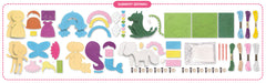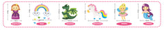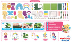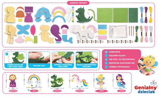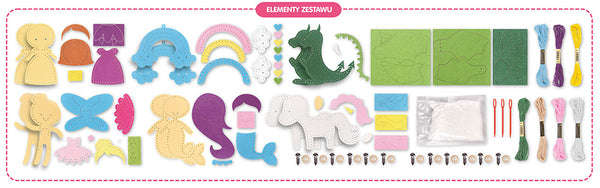W zestawie znajduje się 44 elementy potrzebne do uszycia aż 6 kolorowych postaci: księżniczki, jednorożca, syrenki, wróżki, tęczy i dinozaura.