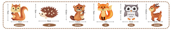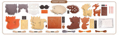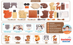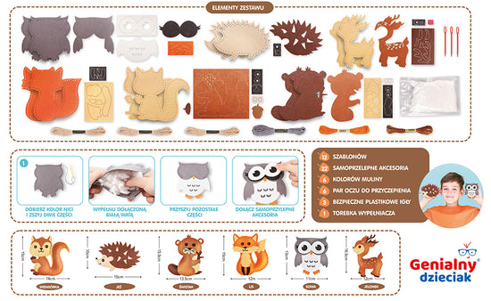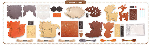 W zestawie znajduje się 50 elementów potrzebne do uszycia aż 6 zwierzątek: wiewiórka, jeż, świstak, lis, sowa, jelonek.
