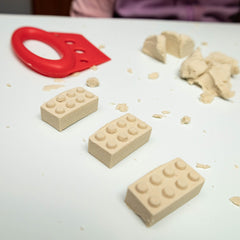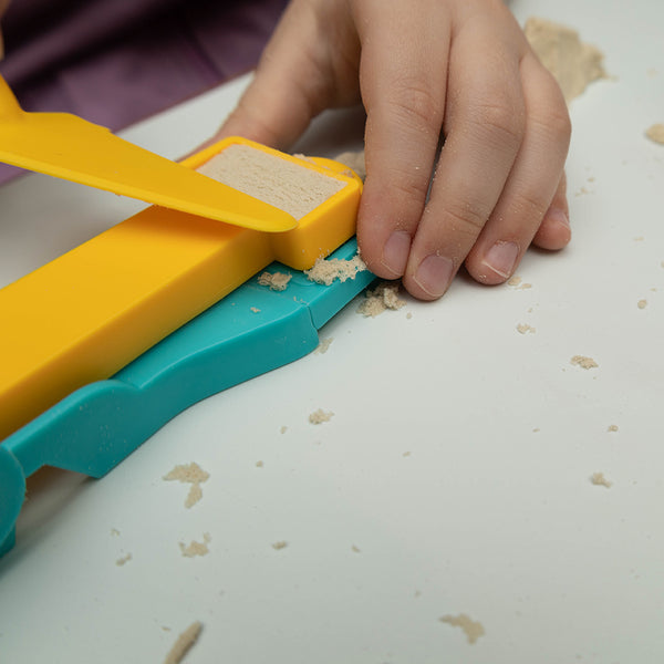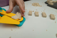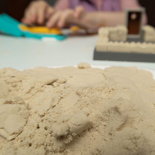 Piasek kinetyczny dołączony do zestawu jest miękki, plastyczny. Po skończonej zabawie wystarczy schować go do pojemnika, by zachował swoje właściwości na długo.