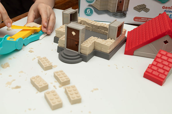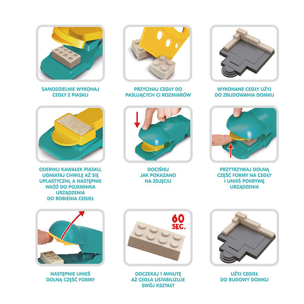 Genialny Dzieciak – Domek z Piasku to niezwykły zestaw kreatywny, który pozwala dzieciom wcielić się w rolę małych budowniczych! Dzięki specjalnej maszynce do formowania cegiełek z piasku kinetycznego można z łatwością stworzyć mury własnego domku.