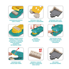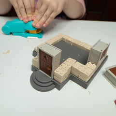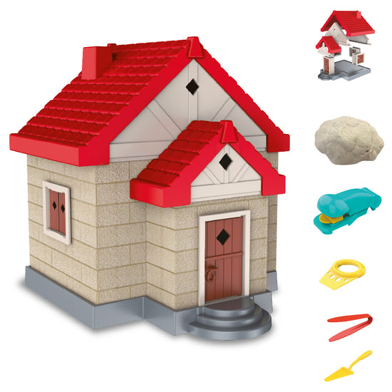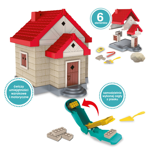 W zestawie znajduje się maszynka do cegieł, packa, szczypce, elementy konstrukcyjne domu takie jak okna, drzwi, podłoga oraz 750 g piasku kinetycznego – wszystko, czego potrzeba, by stworzyć własne miniaturowe cztery ściany!