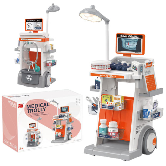 Wózek dentystyczny z RTG to rozbudowany zestaw do zabawy w lekarza, który rozwija wyobraźnię, empatię i zdolności manualne. Składa się z akcesoriów dentystycznych, kartoników do leków i arkusza naklejek. Dzięki temu dziecko może wcielić się w rolę stomatologa i stworzyć własny gabinet.