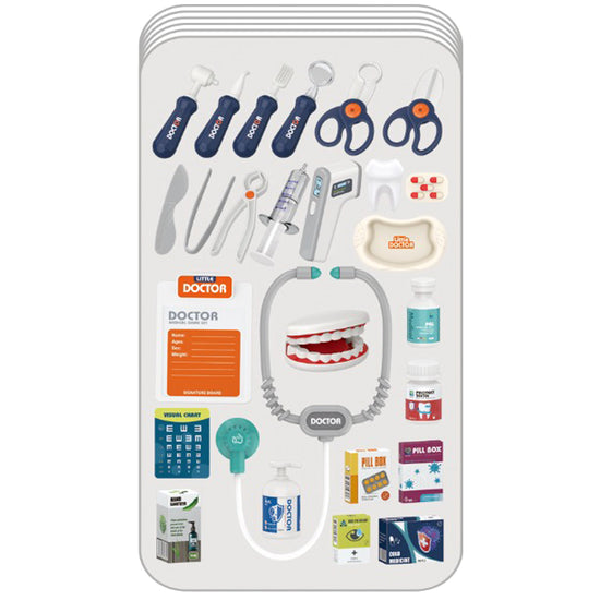 Zestaw wyposażony jest w lampę dentystyczną na baterie oraz termometr z efektami dźwiękowymi i świetlnymi, co dodaje zabawie realizmu. W komplecie znajdują się także niezbędne akcesoria: stetoskop, buteleczki na leki, strzykawka, nożyczki, szczypce, szczęka do ćwiczeń oraz różne narzędzia dentystyczne.