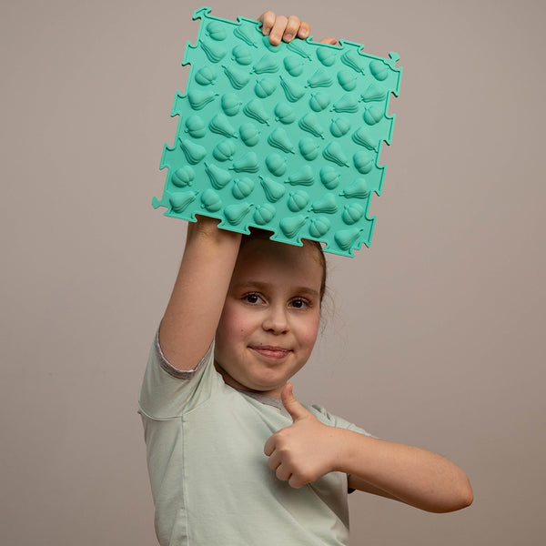 Mata sensoryczna – Dynie miętowe to jeden z wielu elementów o przepięknym intensywnym kolorze z unikalną fakturą, który pozwala na wszechstronną stymulację sensoryczną oraz aktywację mięśni stóp odpowiedzialnych za stabilność i utrzymanie prawidłowej postawy. Regularne ćwiczenia i zabawa na matach pomagają nie tylko w korekcji płaskostopia, ale także w profilaktyce wad postawy, wzmacnianiu stawów oraz treningu równowagi.