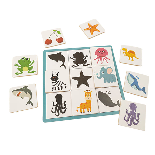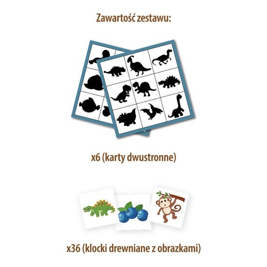Dzięki 36 drewnianym płytkom i 6 dwustronnym kartom z cieniami maluch rozwija spostrzegawczość, koncentrację oraz logiczne myślenie.