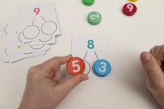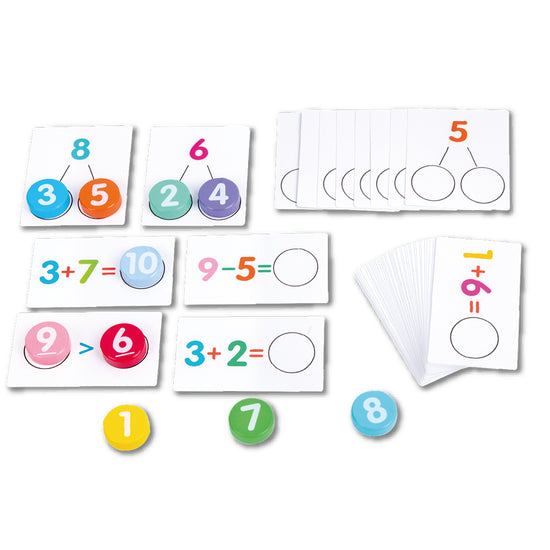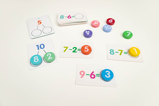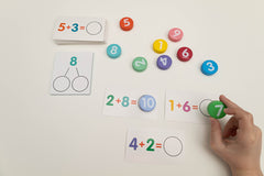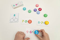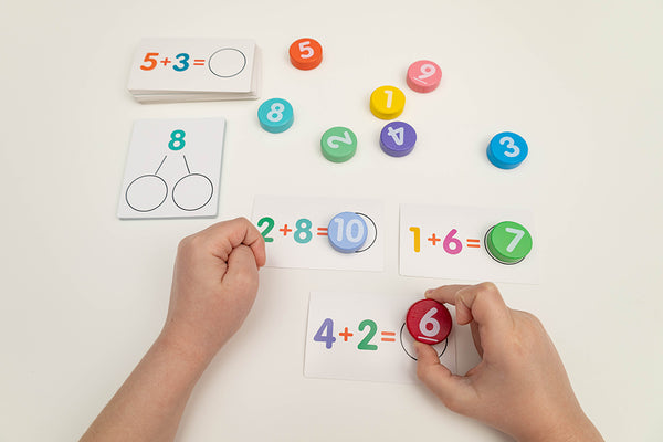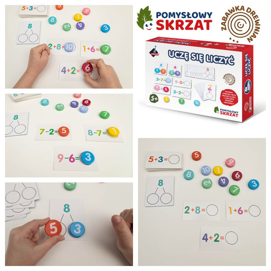 Drewniane krążki z cyframi i kolorowe karty z ćwiczeniami pomagają w przystępny i angażujący sposób odkrywać podstawy matematyki.