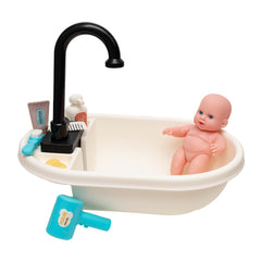 W komplecie znajduje się wanienka z prysznicem, lalka oraz akcesoria do kąpieli: mini-suszarka, butelka szamponu, mydełko, grzebień, szczotka do zębów i tubka pasty.