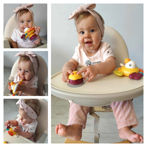 Dzięki różnorodnym fakturom, dźwiękom i elementom do chwytania, kręcenia czy gryzienia, Kaczka angażuje zmysł wzroku, słuchu i dotyku, a jednocześnie rozwija koordynację ruchową oraz motywuje do podnoszenia główki i sięgania po zabawkę podczas leżenia na brzuszku.